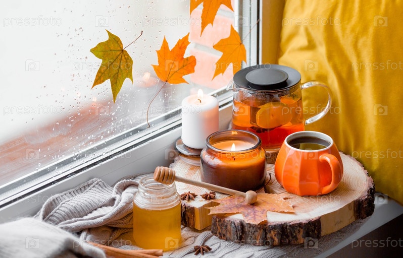 Осенний натюрморт с красивым боке. Чашка горячего чая, чайник, мед, свечи и вязаный плед на подоконнике. За окном осенние листья и капли дождя