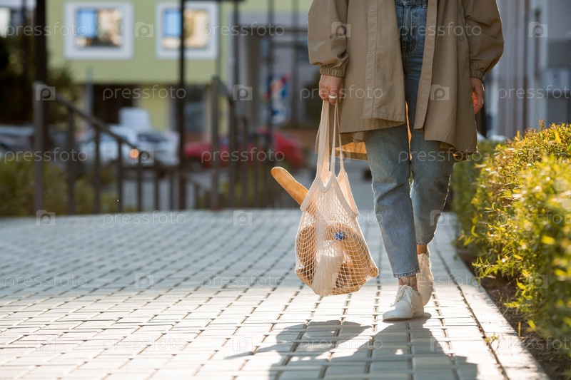 Современная стильная женщина со стеклянной бутылкой молока и авоськой Концепция здорового питания и экологии. Отказ от пластиковых пакетов