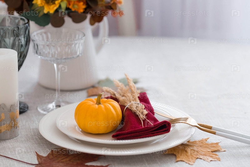 Красивая осенняя сервировка стола. Тарелка с хлопчатобумажной салфеткой и тыквой. Столовое золото и ваза с осенними цветами на льняной скатерти. Концепция праздничной сервировки на День Благодарения