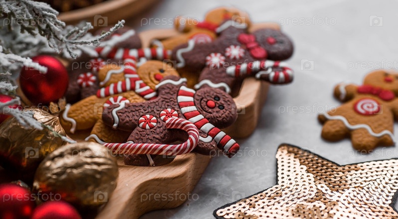 С Новым 2023 годом. Баннер с рождественскими украшениями, корицей, выпечкой и пряничными человечками на мраморном фоне. Поздравительная открытка на Рождество. Концепция кафе и ресторанов