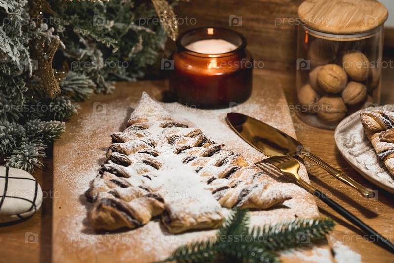 Мягкий фокус. Новогодний стол. Угощения для гостей. Торт из слоеного теста с шоколадом в виде елки на деревянном фоне. Концепция приготовления пищи на праздник