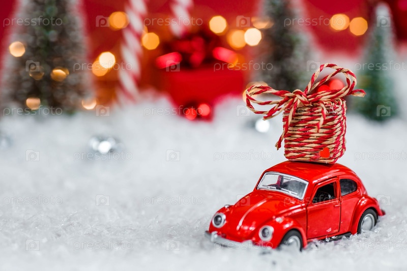 Рождественский красный ретро-автомобиль с подарочной коробкой в красном снежном пейзаже на фоне боке. Место для текста. Концепция доставки товаров и поздравительная открытка с Новым годом