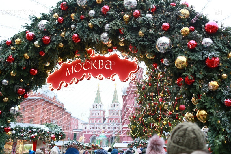 Новый год. Новогодние украшения на улицах Москвы. Рождественские праздники, зимний пейзаж. Рождественская ярмарка на празднично украшенной Красной площади. Надпись на красной табличке: «Москва»