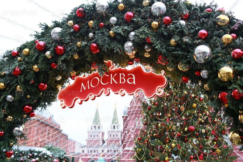 Новый год. Новогодние украшения на улицах Москвы. Рождественские праздники, зимний пейзаж. Рождественская ярмарка на празднично украшенной Красной площади. Надпись на красной табличке: «Москва»