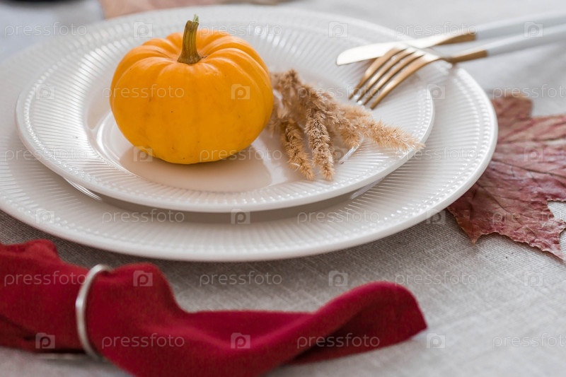 Красивая осенняя сервировка стола. Тарелка с хлопчатобумажной салфеткой и тыквой. Столовое золото и ваза с осенними цветами на льняной скатерти. Концепция праздничной сервировки на День Благодарения