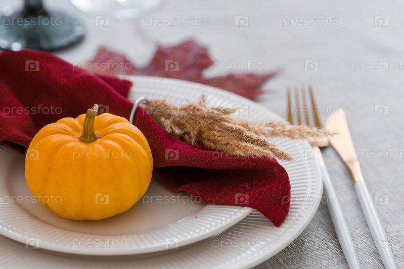 Красивая осенняя сервировка стола. Тарелка с хлопчатобумажной салфеткой и тыквой. Столовое золото и ваза с осенними цветами на льняной скатерти. Концепция праздничной сервировки на День Благодарения