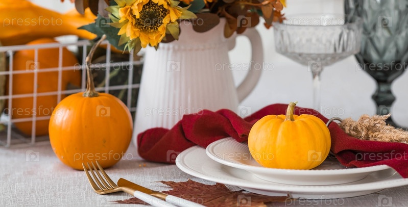 Красивая осенняя сервировка стола. Тарелка с хлопчатобумажной салфеткой и тыквой. Столовое золото и ваза с осенними цветами на льняной скатерти. Концепция праздничной сервировки на День Благодарения