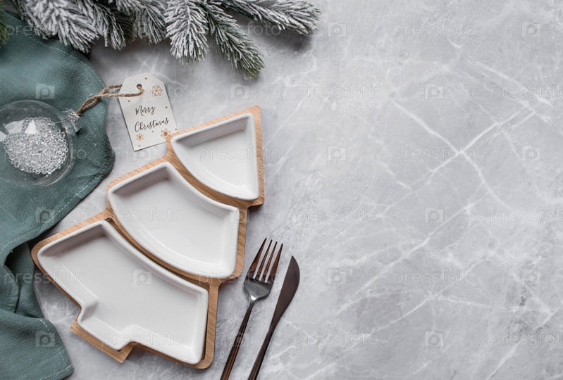 Сервировка стола. Тарелка в виде елки, зеленая салфетка, еловые ветки и елочные украшения на сером фоне. Концепция счастливого Рождества, Нового 2023 года и ресторанов