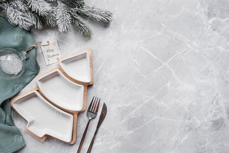 Сервировка стола. Тарелка в виде елки, зеленая салфетка, еловые ветки и елочные украшения на сером фоне. Концепция счастливого Рождества, Нового 2023 года и ресторанов