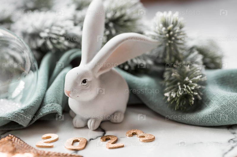 Красивая праздничная открытка. Концепция счастливого нового года и Рождества. Символ года — белый кролик на фоне еловых веток и цифры 2023