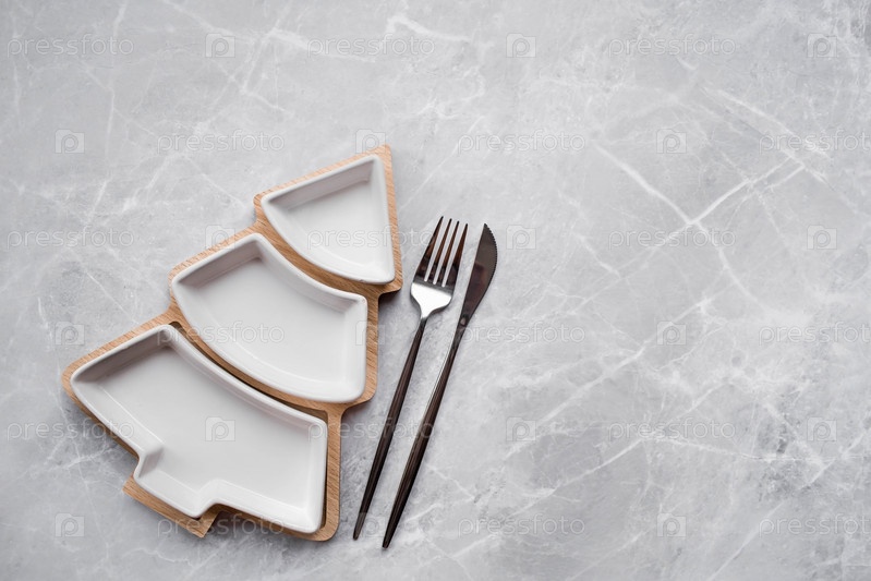 Сервировка стола. Тарелка в виде елки и столовые приборы на сером фоне. Концепция счастливого Рождества, Нового 2023 года и ресторанов
