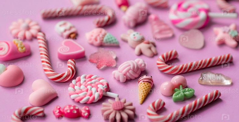 Зефир и леденцы. Жевательные конфеты крупным планом на розовом фоне. Десерт из сладких блюд. Концепция Рождества и Нового года для кондитерской. Пастельные цвета. Копия текстового пространства