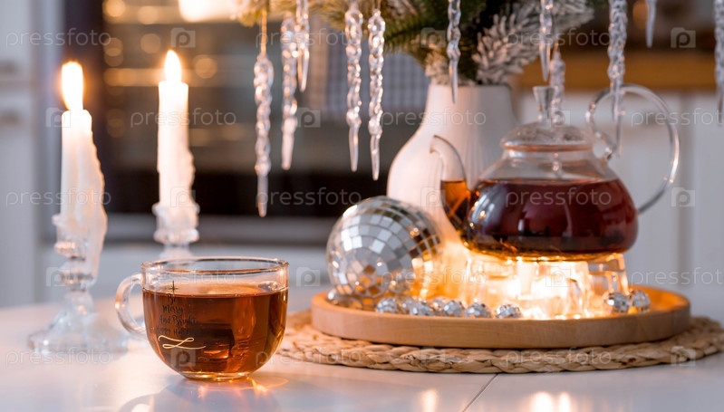 Букет еловых веток с сосульками, свечи и чайник с чаем на деревянном столе в домашнем интерьере белой кухни в скандинавском стиле. Уютная концепция праздничных напитков