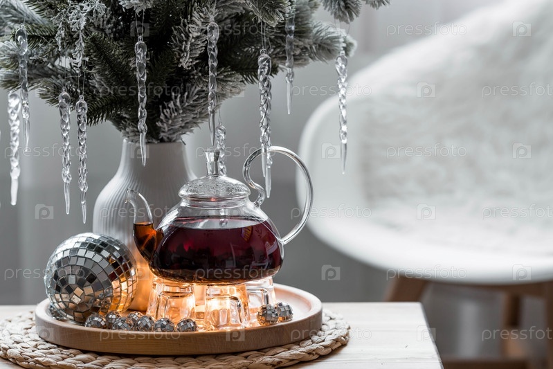 Букет еловых веток с сосульками, свечи и чайник с чаем на деревянном столе в домашнем интерьере гостиной. Уютная концепция праздничных напитков
