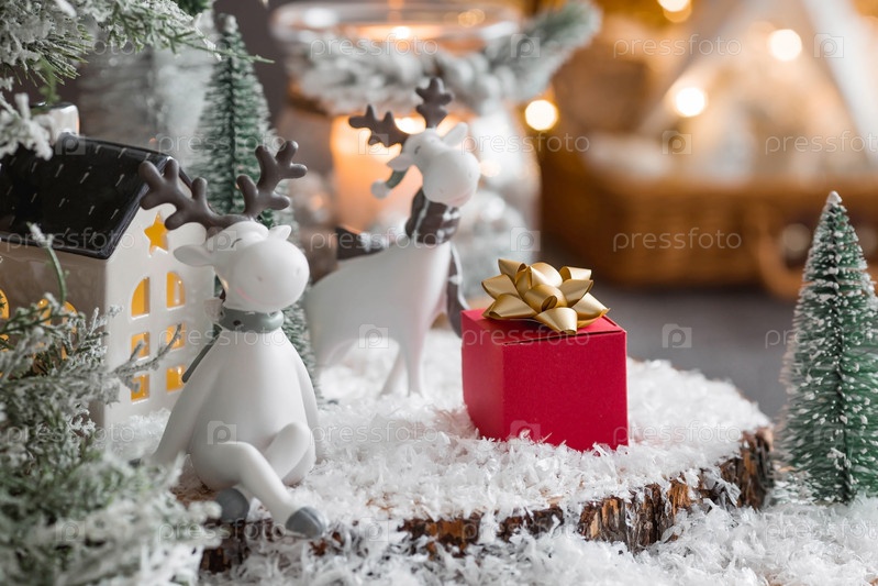 С Новым 2023 годом. Рождественская открытка, баннер с забавными оленями, елки и красная подарочная коробка с золотым бантом. Новогодний натюрморт. Концепция домашнего праздника, тепла и уюта