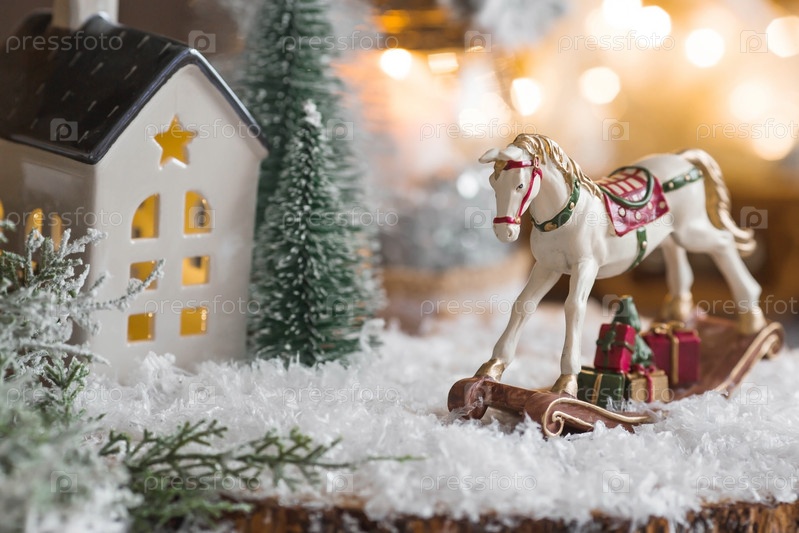С Новым 2023 годом. Рождественская открытка, баннер с лошадкой-качалкой, елки, подарки и красивое боке на заднем плане. Концепция домашнего зимнего отдыха, тепла и уюта