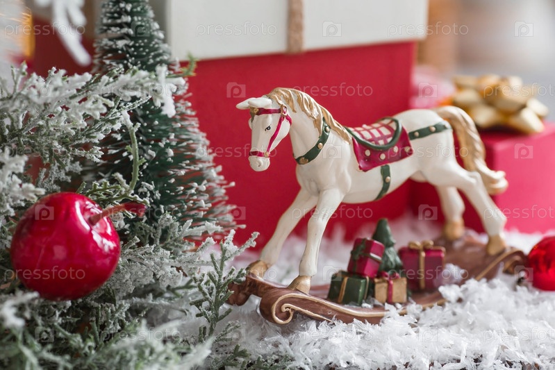 С Новым 2023 годом. Рождественская открытка, баннер с лошадкой-качалкой, елки, подарки и красивое боке на заднем плане. Концепция домашнего зимнего отдыха, тепла и уюта