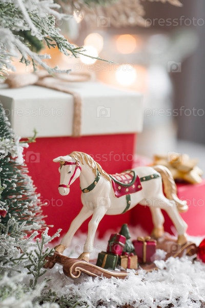 С Новым 2023 годом. Рождественская открытка, баннер с лошадкой-качалкой, елки, подарки и красивое боке на заднем плане. Концепция домашнего зимнего отдыха, тепла и уюта