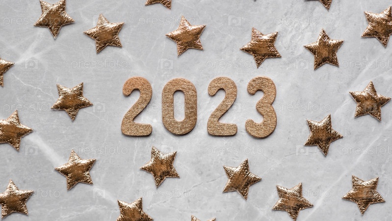 Баннер. С Новым Годом. Золотые цифры 2023 и золотые звезды на модном сером мраморном фоне. Плоская планировка