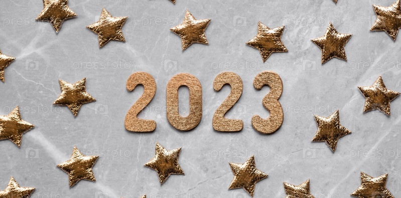 Баннер. С Новым Годом. Золотые цифры 2023 и золотые звезды на модном сером мраморном фоне. Плоская планировка