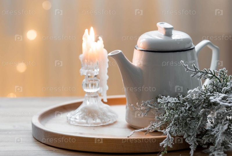 Букет еловых веток, горящая свеча и белый керамический чайник на деревянном столе в домашнем интерьере гостиной. Уютная концепция праздничных напитков