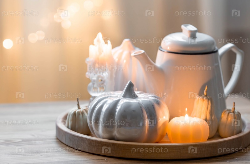 Натюрморт. Белые керамические тыквы и свечи в форме тыквы на журнальном столике в домашнем интерьере гостиной. Детали декора. Уютная осенняя концепция