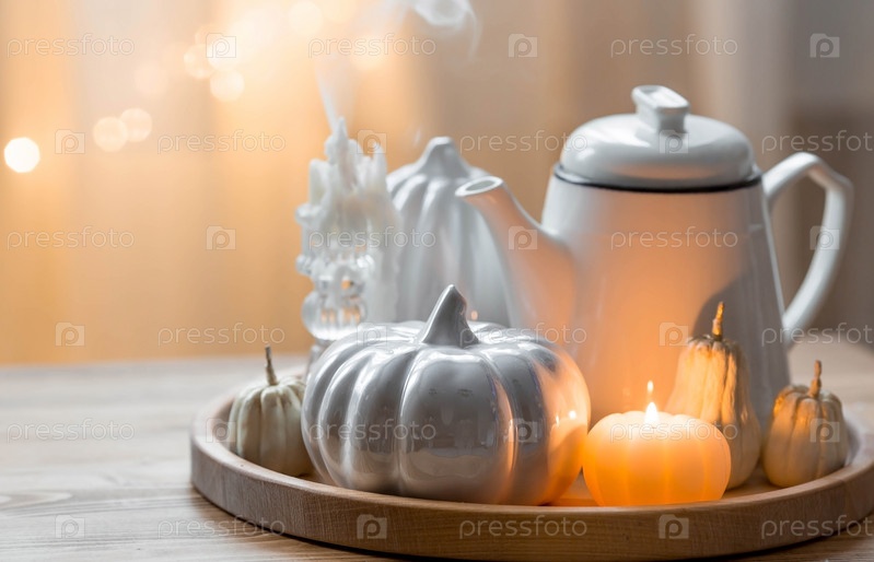 Натюрморт. Белые керамические тыквы и свечи в форме тыквы на журнальном столике в домашнем интерьере гостиной. Детали декора. Уютная осенняя концепция