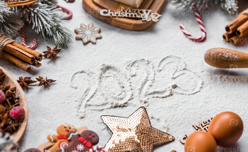 С Новым 2023 годом. Баннер с кухонной утварью, рождественскими украшениями, корицей, пряниками и елью на мраморном фоне. Поздравительная открытка на Рождество. Концепция кафе и ресторанов