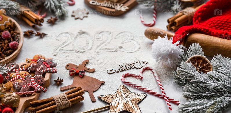 С Новым 2023 годом. Баннер с кухонной утварью, рождественскими украшениями, корицей, пряниками и елью на мраморном фоне. Поздравительная открытка на Рождество. Концепция кафе и ресторанов