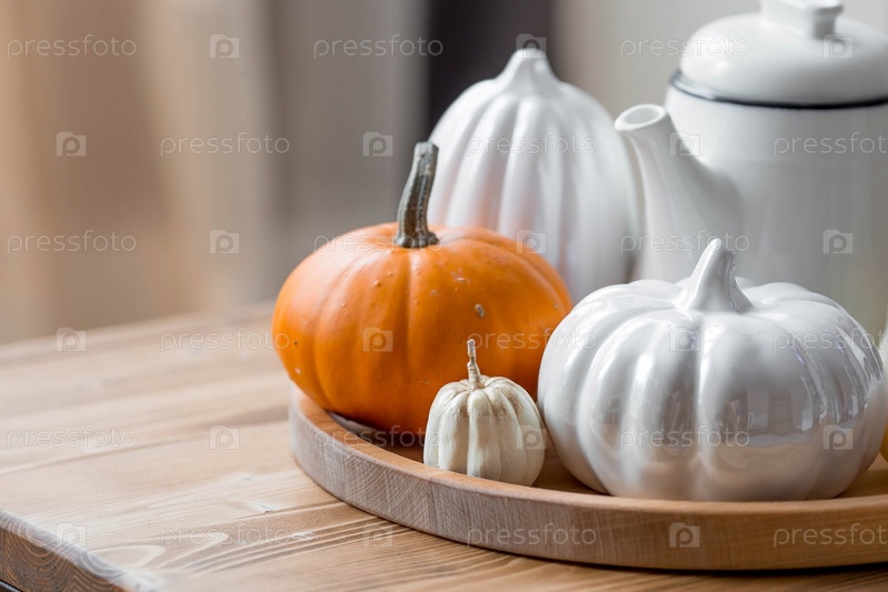 Натюрморт. Белые керамические тыквы и свечи в форме тыквы на журнальном столике в домашнем интерьере гостиной. Детали декора. Уютная осенняя концепция