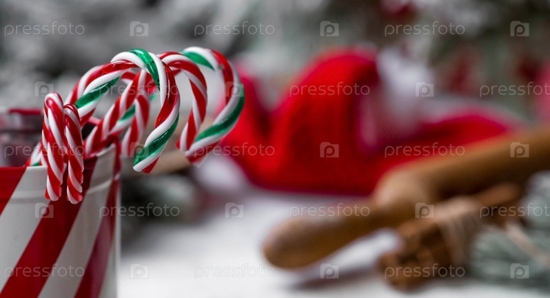 С Новым 2023 годом. Баннер. Полосатые леденцы в банке, место для копирования текста. Леденец трость. Поздравительная открытка на Рождество. Концепция магазина сладостей