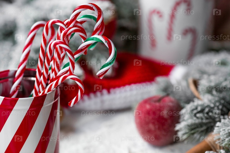 С Новым 2023 годом. Баннер. Полосатые леденцы в банке, место для копирования текста. Леденец трость. Поздравительная открытка на Рождество. Концепция магазина сладостей