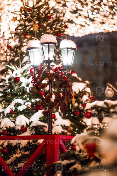 Новогоднее украшение ночных улиц. Красивые праздничные пейзажи в городе. Украшенные елки. Новогодние зимние каникулы 2023