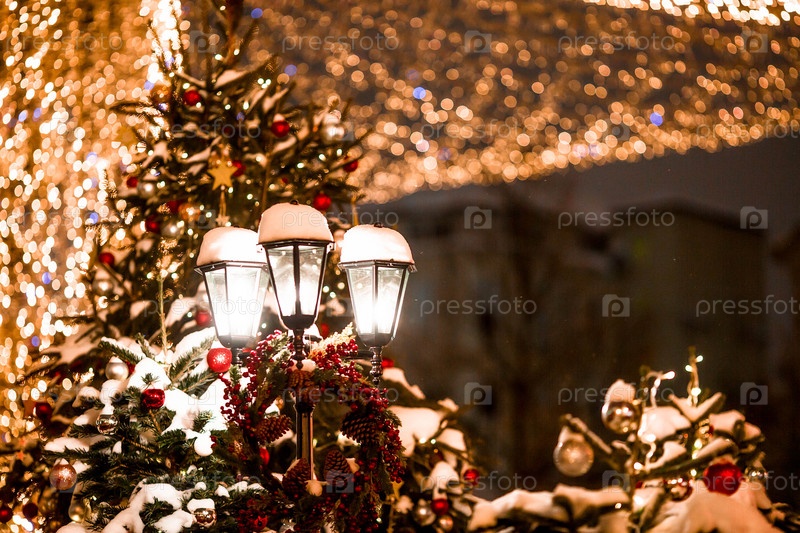 Новогоднее украшение ночных улиц. Красивые праздничные пейзажи в городе. Украшенные елки. Новогодние зимние каникулы 2023