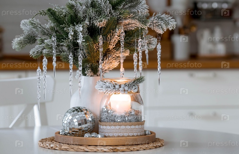 Еловый букет с сосульками на белом кухонном столе. Новогодние украшения в интерьере. Концепция подготовки к новогоднему празднику