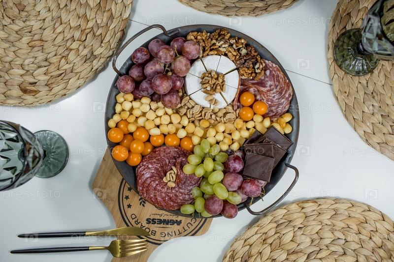 Закуска для гостей. Тарелка с сыром, салями, орехами, виноградом и закусками на черной железной тарелке. Антипасто. итальянская кухня
