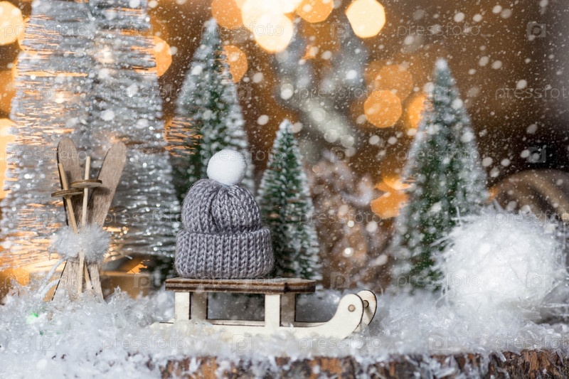 С Новым 2022 годом. Красивый фон со свечами, санками с вязаной шапкой, елками и украшениями. Празднование зимних рождественских каникул. Концепция начала года