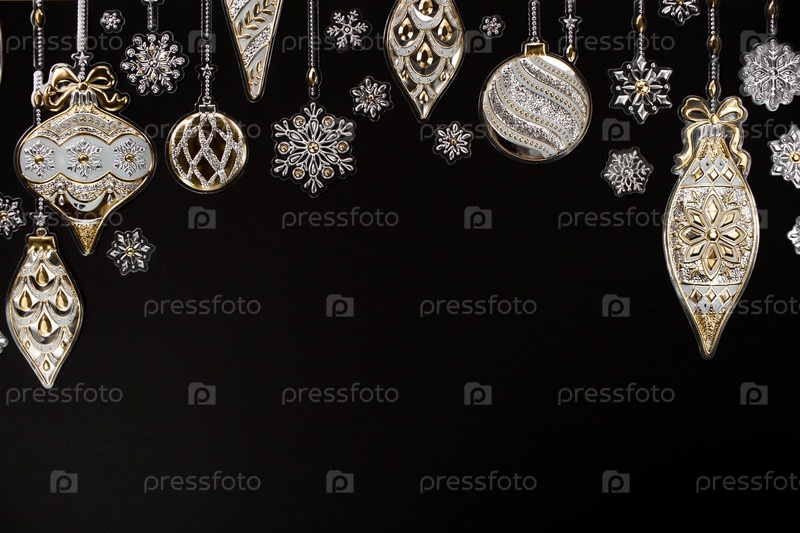 Баннер. С Новым годом и Рождеством 2022. Снежинки с елочными игрушками из золотой и серебряной фольги на черном фоне. Плоская планировка