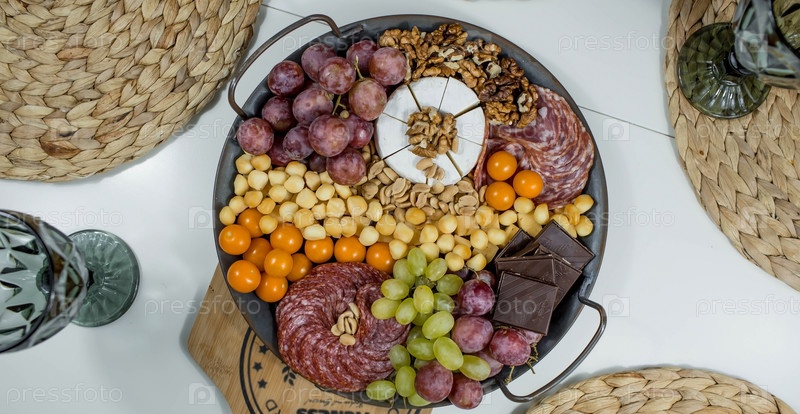 Закуска для гостей. Тарелка с сыром, салями, орехами, виноградом и закусками на черной железной тарелке. Антипасто. итальянская кухня