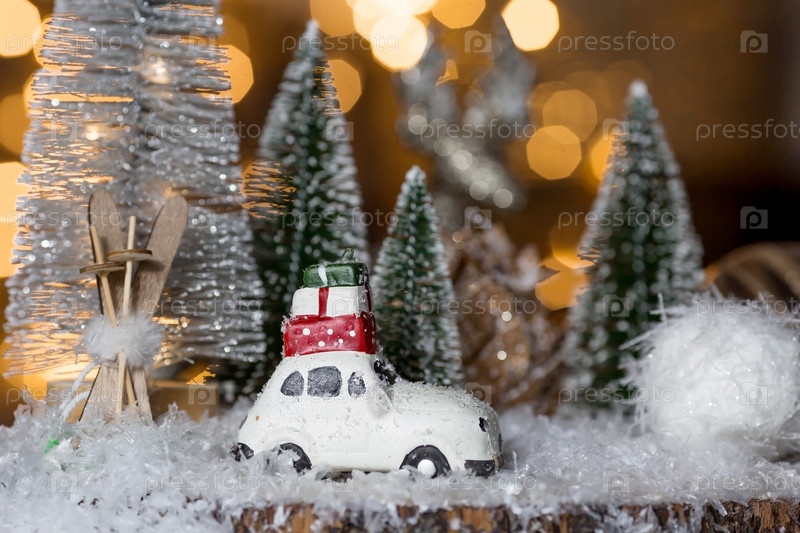 С Новым 2022 годом. Красивый фон с автомобилем с красной шапкой на крыше, елками и украшениями. Празднование зимних рождественских каникул. Концепция начала года