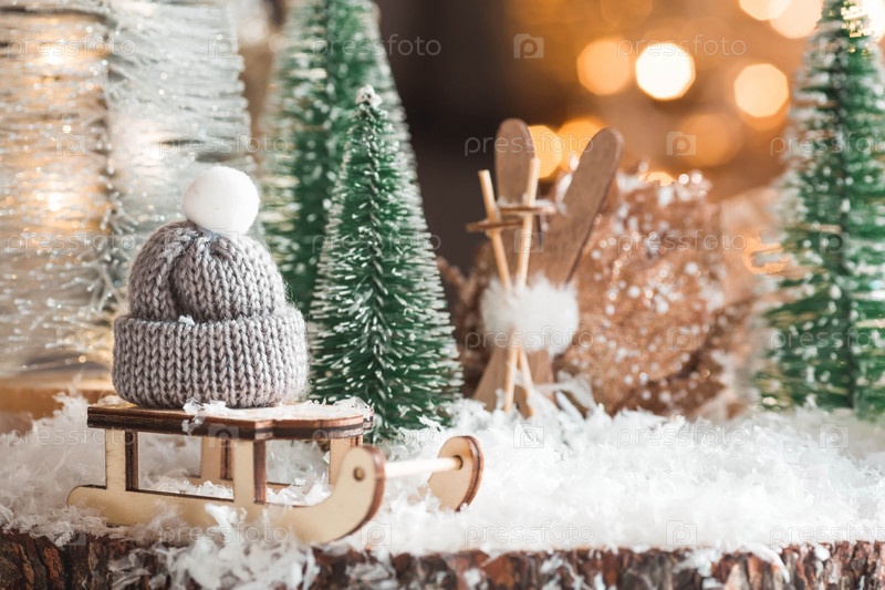С Новым 2022 годом. Красивый фон со свечами, санками с вязаной шапкой, елками и украшениями. Празднование зимних рождественских каникул. Концепция начала года