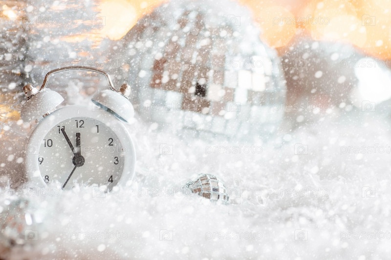 Красивый фон с часами, блестками, шарами и украшениями. Обратный отсчет до полуночи. Часы последних мгновений перед Новым 2023 годом. Празднование зимних рождественских праздников