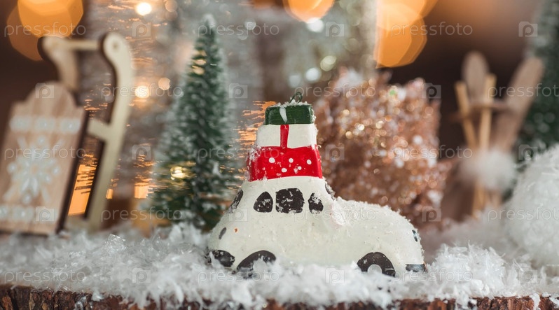 С Новым 2022 годом. Красивый фон с автомобилем с красной шапкой на крыше, елками и украшениями. Празднование зимних рождественских каникул. Концепция начала года