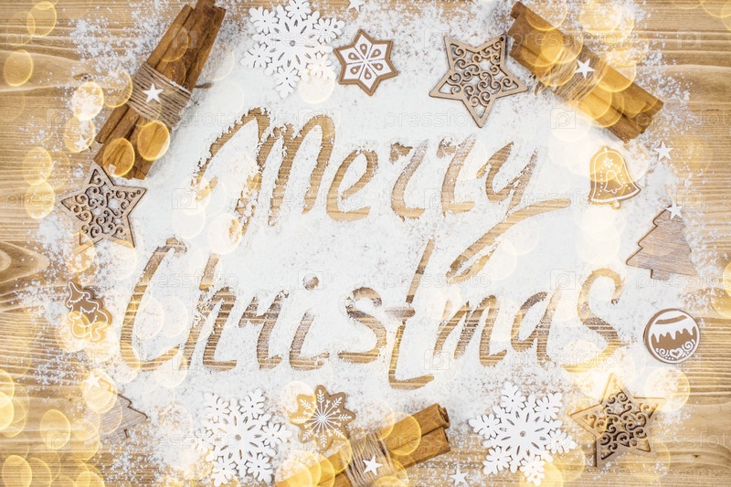 Надпись на муке с Рождеством. Рамка из корицы, печенья, сушеных апельсинов, оленей и рождественских украшений на деревянном фоне. Концепция кафе и ресторанов. Новый год 2023