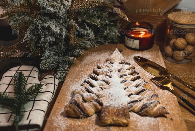 Мягкий фокус. Новогодний стол. Угощения для гостей. Торт из слоеного теста с шоколадом в виде елки на деревянном фоне. Концепция приготовления пищи на праздник