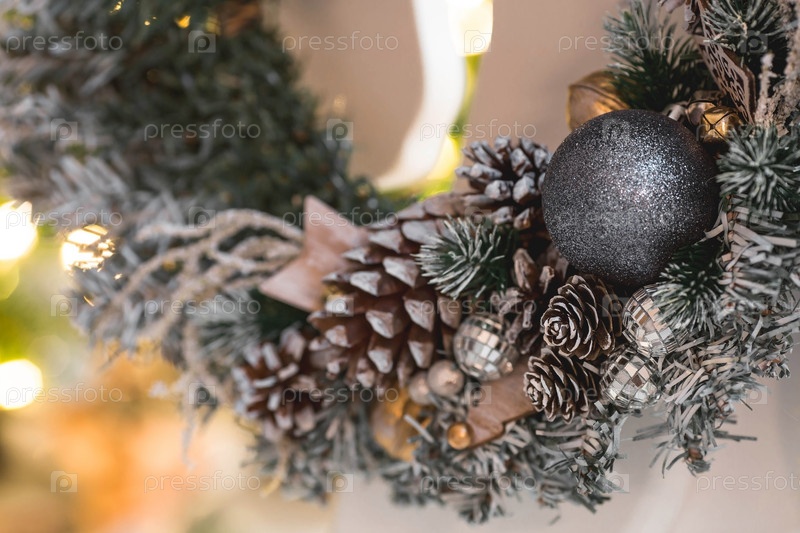 Баннер. Зеленый рождественский венок в серо-золотых тонах. Концепция празднования и праздничных украшений. Декор дома к новому 2023 году. Копия текстового пространства