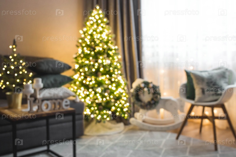 Абстрактный размытый свет боке. Уютный декор в интерьере новогодней комнаты, елка, украшенная гирляндами. Праздничная гостиная в доме. Красивый новогодний фон 2022 года