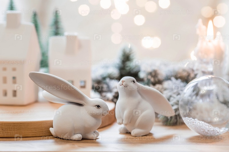 Рождественские елки, белый кролик и скандинавские белые домики на деревянном столе в уютной гостиной. Стильная новогодняя открытка в скандинавском стиле
