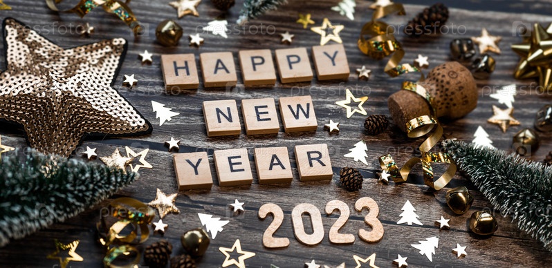 Баннер. Символ числа 2023 с золотыми шарами, звездами, блестками и елкой на деревянном фоне. Концепция празднования Нового 2023 года и Рождества
