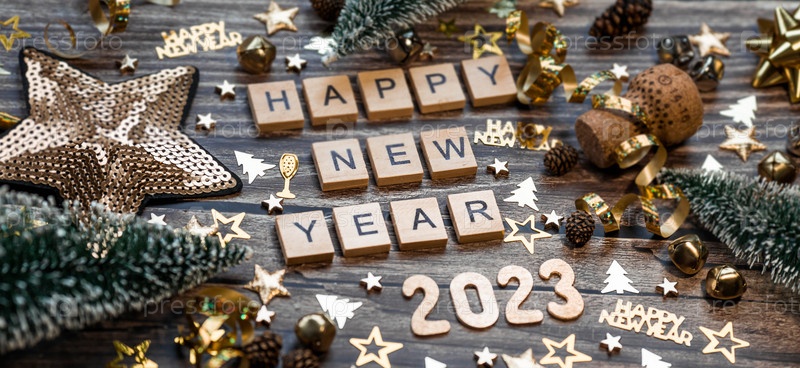 Баннер. Символ числа 2023 с золотыми шарами, звездами, блестками и елкой на деревянном фоне. Концепция празднования Нового 2023 года и Рождества